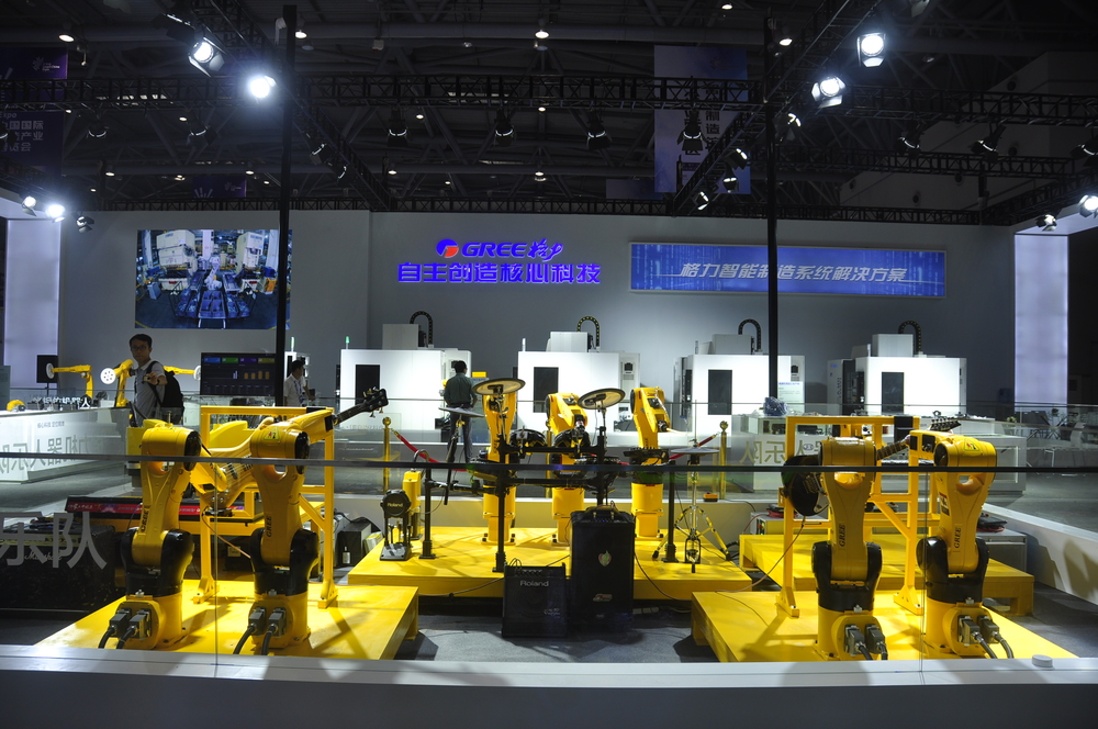? ? ? ? 如果工業(yè)化集成應(yīng)用區(qū)的展出產(chǎn)品更受智能裝備專業(yè)人士的歡迎,那么格力工業(yè)機器人樂隊則引來了眾多普通參展者的圍觀。一群外形精致,身手靈活的“小黃人”成為格力展區(qū)上的“明星”。它們有的打鼓,有的彈琴,有的在一旁用吉他、貝斯、鐘琴伴奏,一首雄壯悠揚的《歌唱祖國》奏響于重慶智博會。